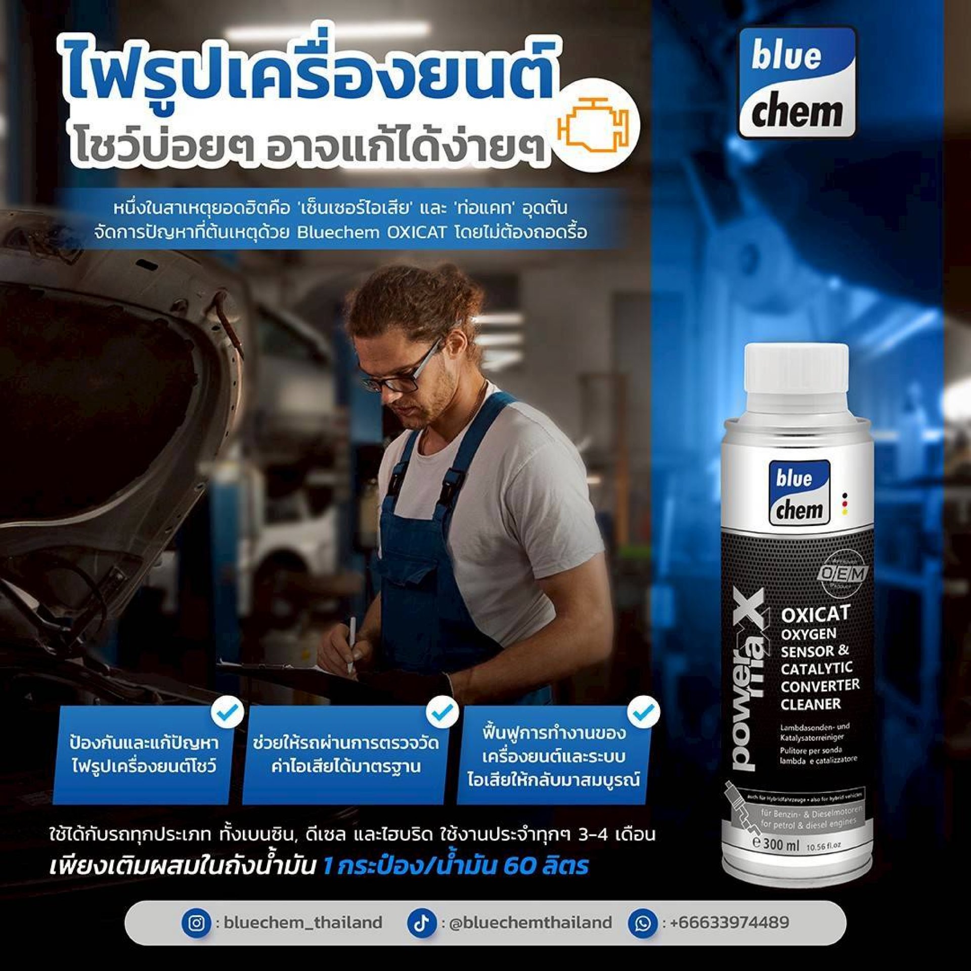 Bluechem OXICAT ถูกออกแบบมาเพื่อดูแลระบบไอเสียโดยเฉพาะ ช่วยลดคราบสะสมที่เป็นต้นเหตุของปัญหา และช่วยให้การทำงานของเซนเซอร์กลับมามีประสิทธิภาพมากขึ้น