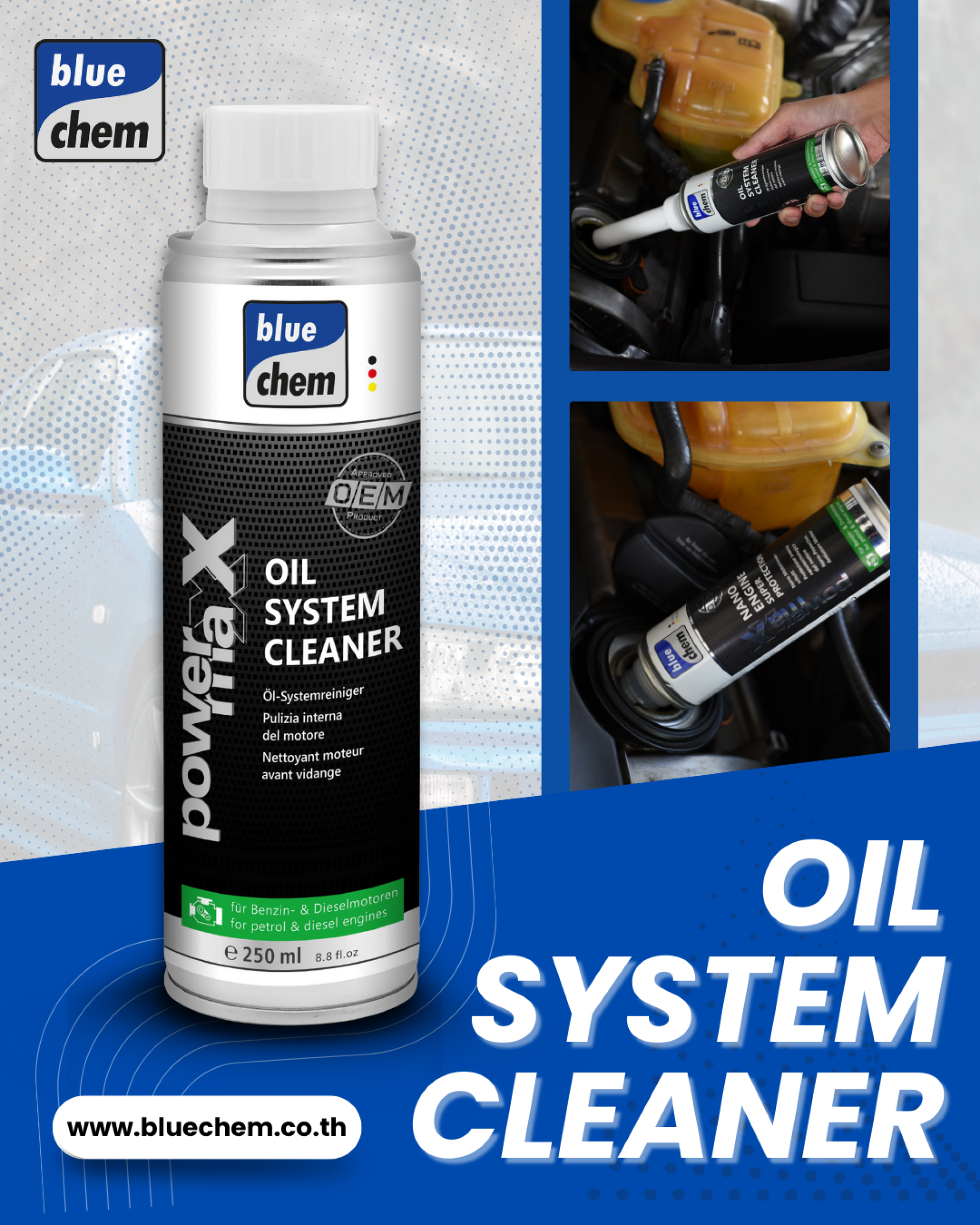 Bluechem Oil System Cleaner หรือ Engine Flush ถูกออกแบบมาเพื่อช่วยละลายและชะล้างคราบสลัดจ์ที่สะสมอยู่ภายในเครื่องยนต์